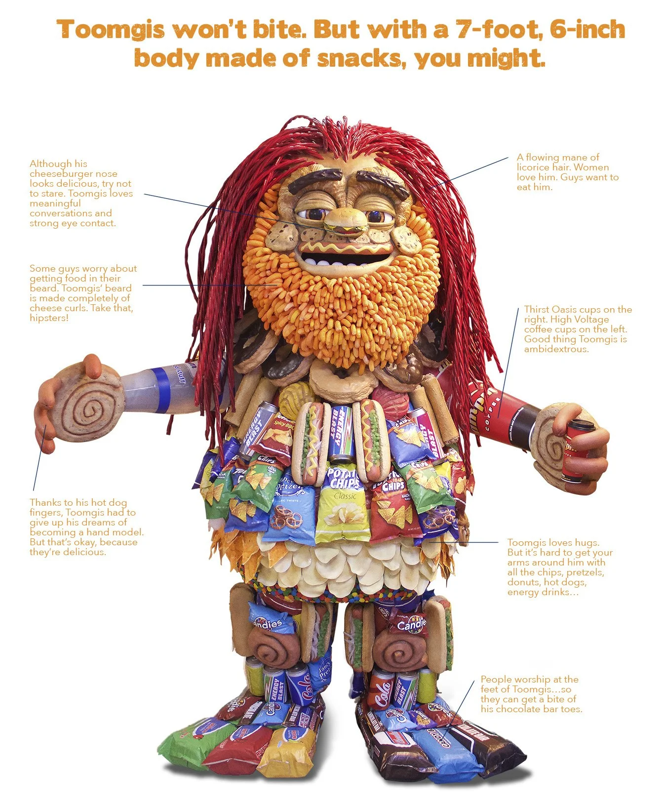 One of my first jobs as a copywriter was creating social content for ampm’s oft-maligned snack monster, Toomgis. A discerning eye might clock that his name is inspired by the brand’s tagline “Too Much Good Stuff”. Though the brand sunk a lot of money into this mascot–his costume was designed by the Jim Henson company and it required two SAG actors to embody for live action commercials–Toomgis rubbed many the wrong way.